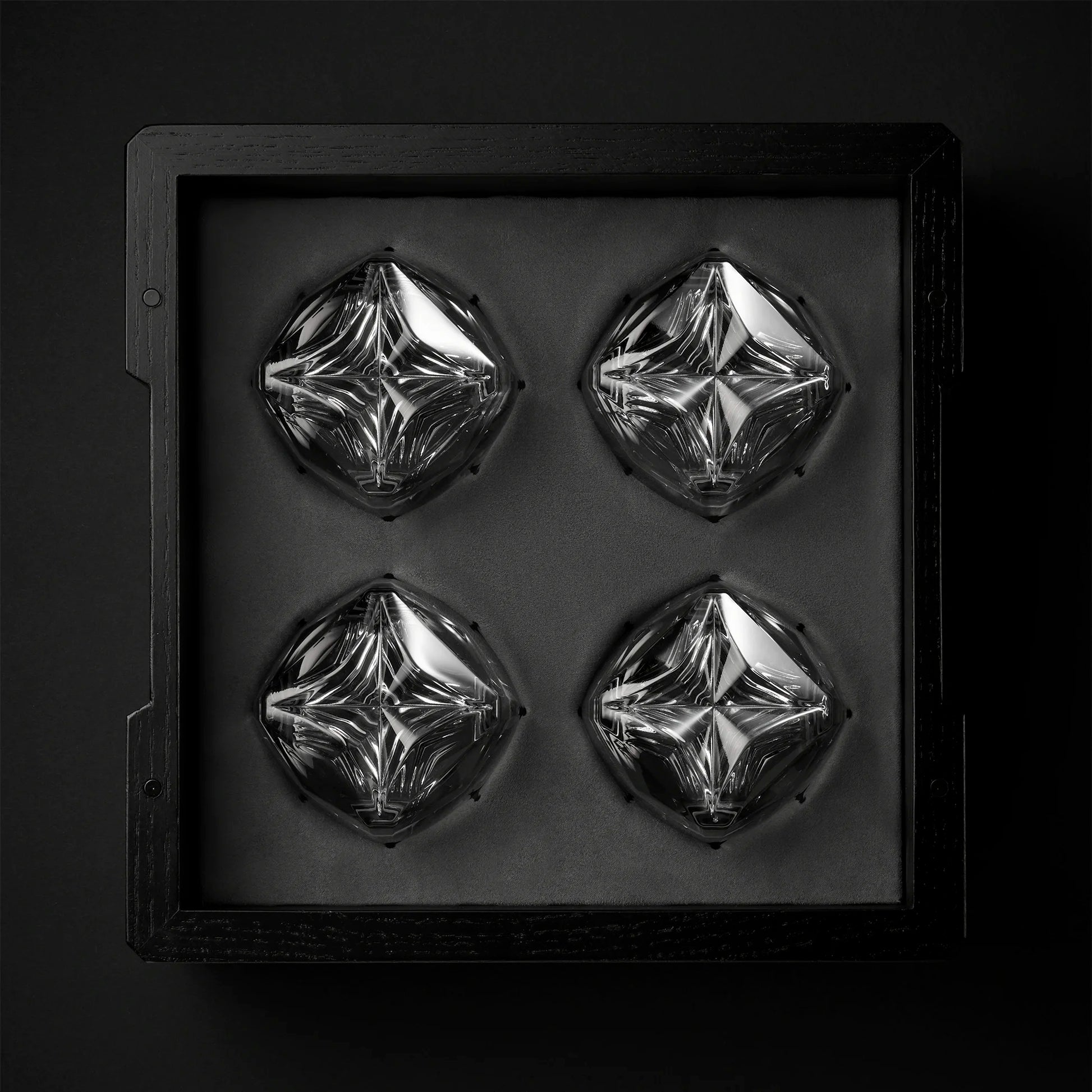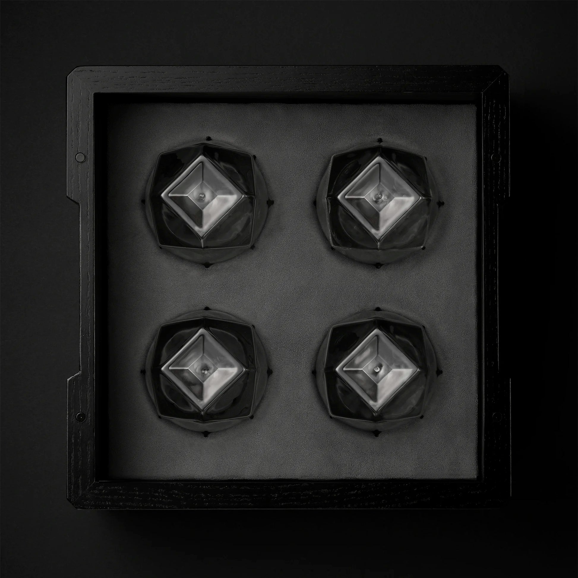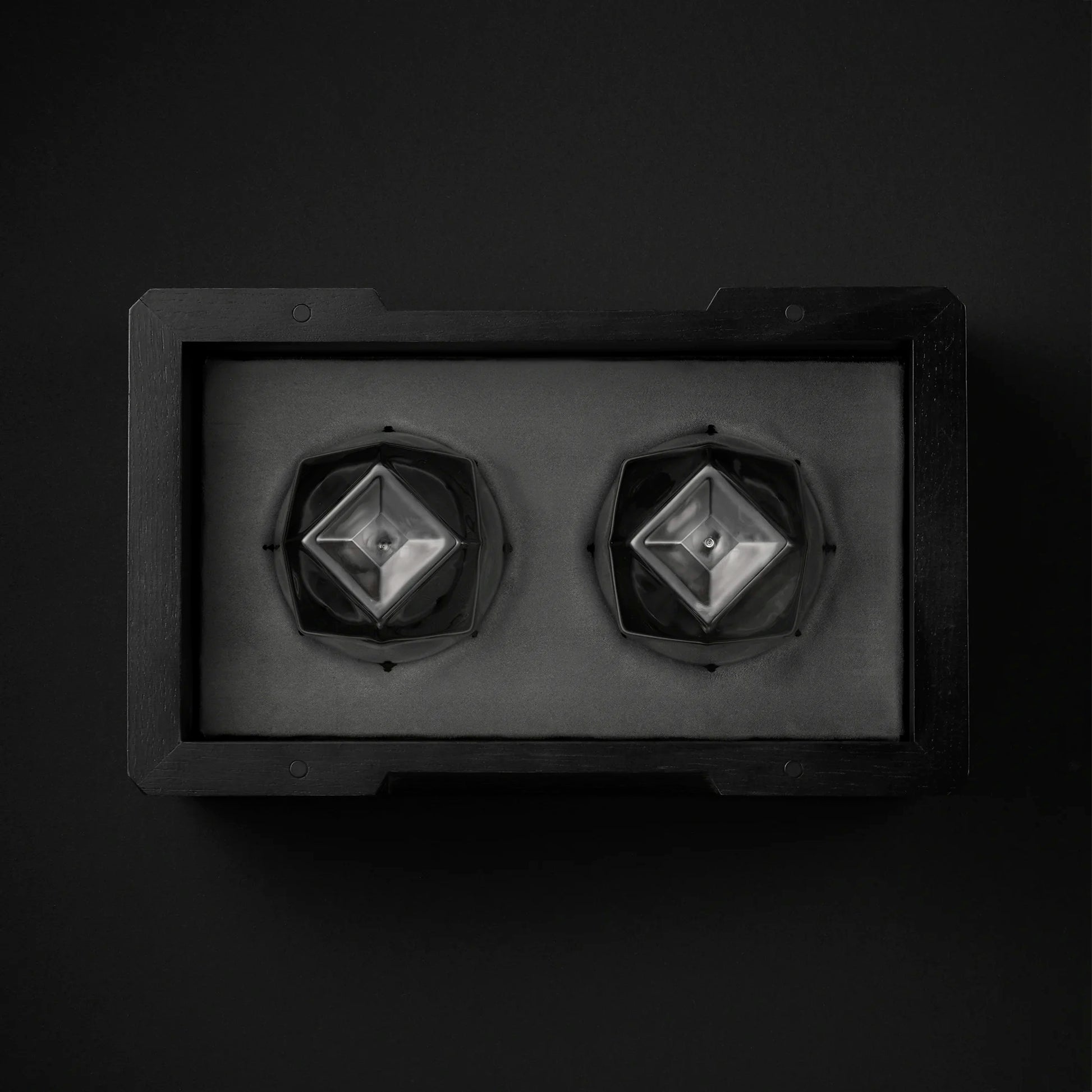 Inside, a soft-touch, dusty-grey vegan leather insert holds each glass in place like a gem set in fine jewelry. The inverted glasses are cradled in silos, shielded by a flush, removable lid secured by blackened rare-earth magnets—subtly hidden but undeniably firm.