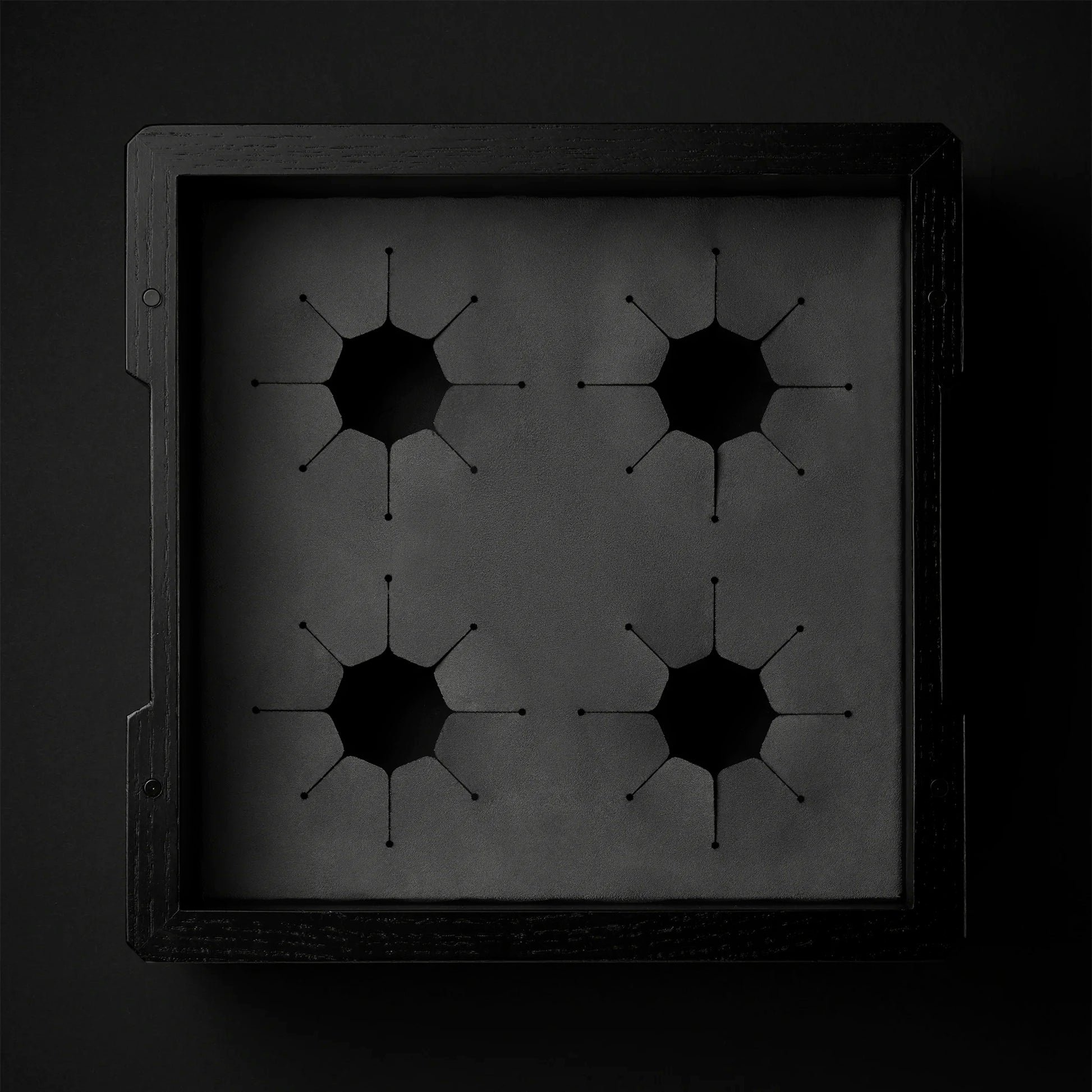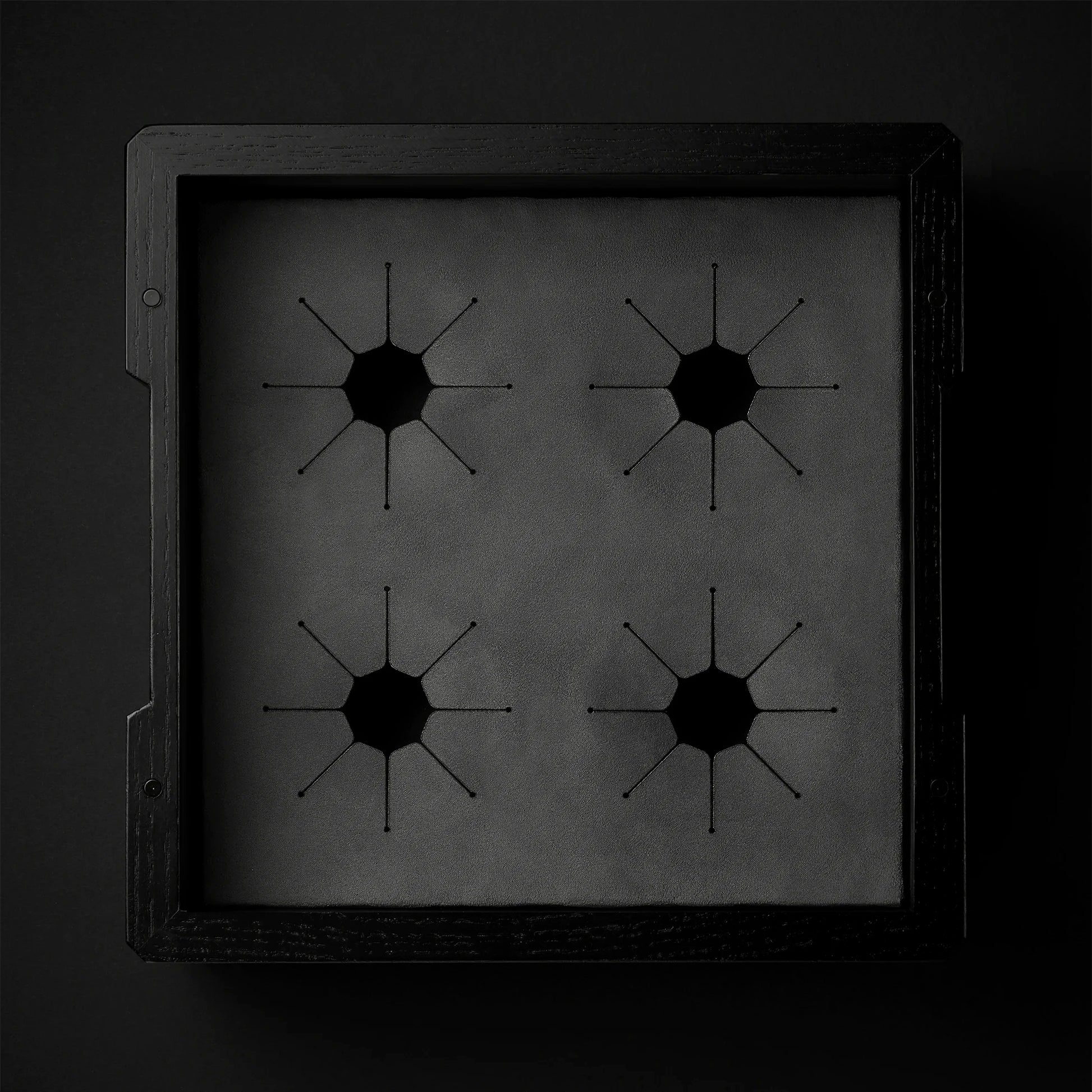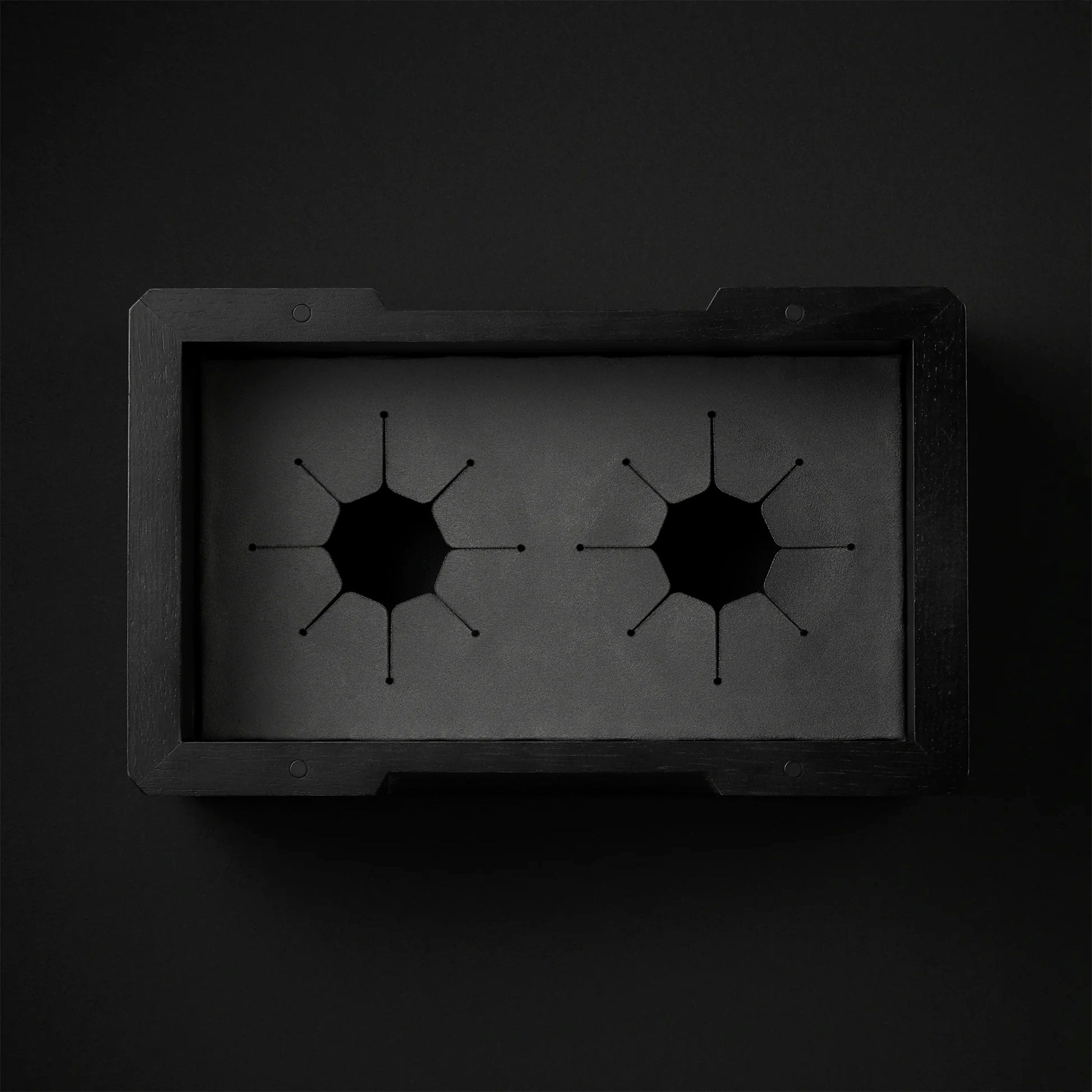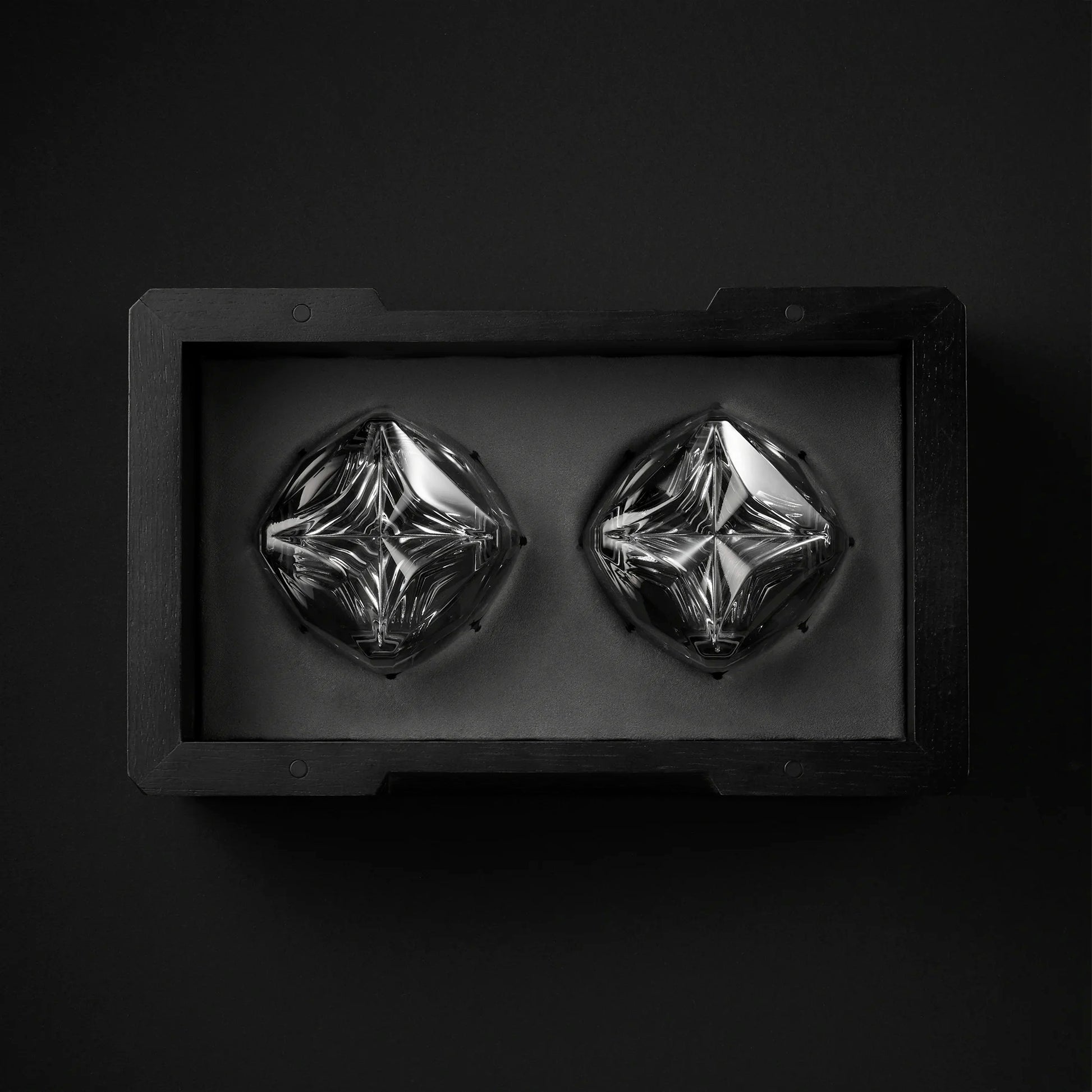 Inside, a soft-touch, dusty-grey vegan leather insert holds each glass in place like a gem set in fine jewelry. The inverted glasses are cradled in silos, shielded by a flush, removable lid secured by blackened rare-earth magnets—subtly hidden but undeniably firm.