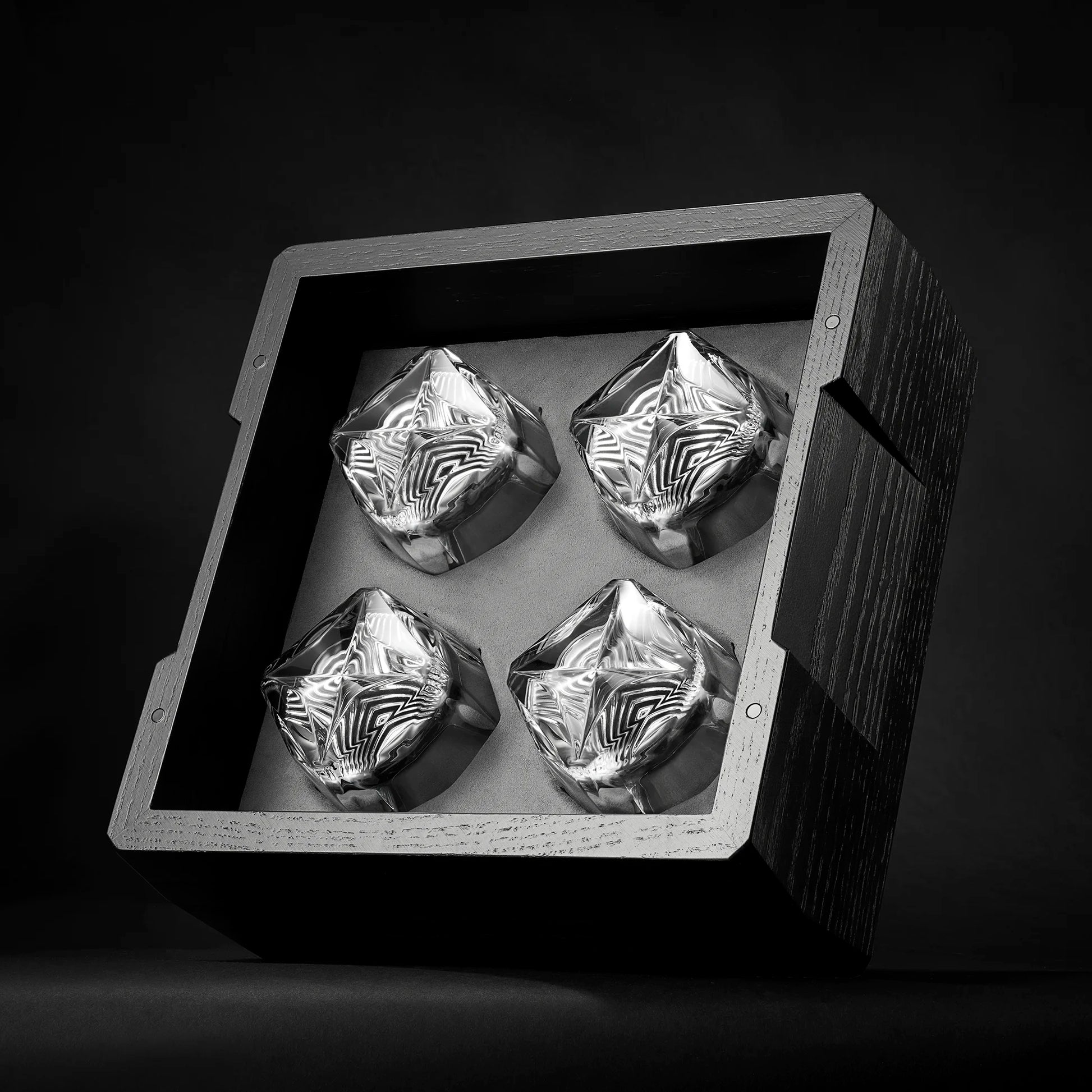 Available in both two- and four-glass configurations, the Kist now returns in its Second Edition, redesigned to accommodate not only the Norlan Whisky Glass and Norlan Steel Tumbler, but also the Rauk Heavy Tumbler (250 mL). Finished in a deep black spirit-based stain with a satin lacquer topcoat, it stands as a timeless object — one that celebrates the craftsmanship of fine glassware and the rituals that surround it.